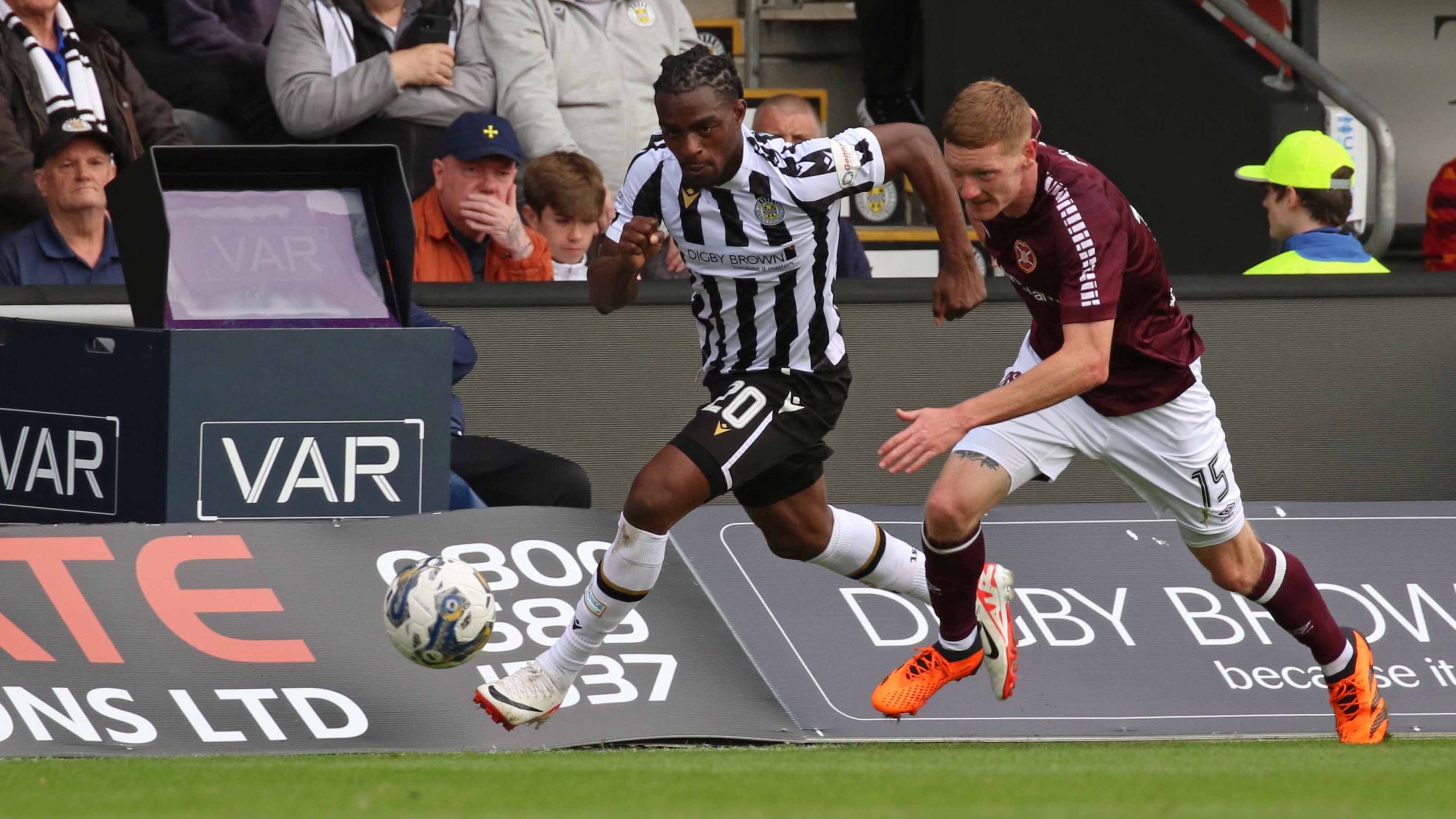 Photo: Saints Keanu Baccus wins a tackle with Hearts Baningime