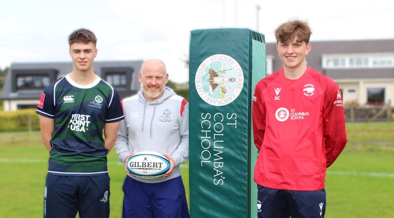 Headline Photo: (Left to Right) St Columba’s 1st XV Captain Gregor Douglass, St Columba’s School Director of Sport & PE Gordi Reid and Birkmyre 1st XV Stand-Off David Cruickshank