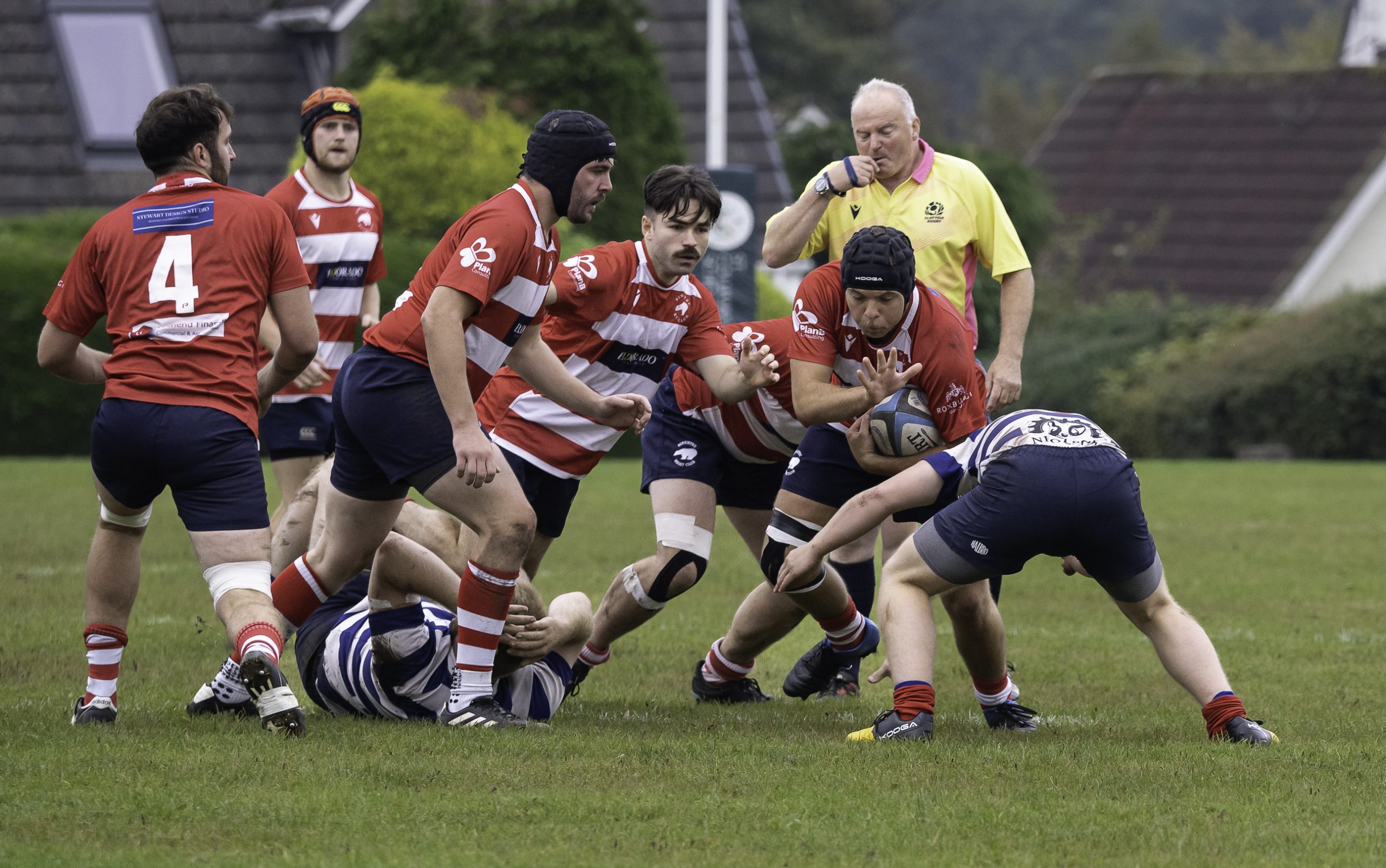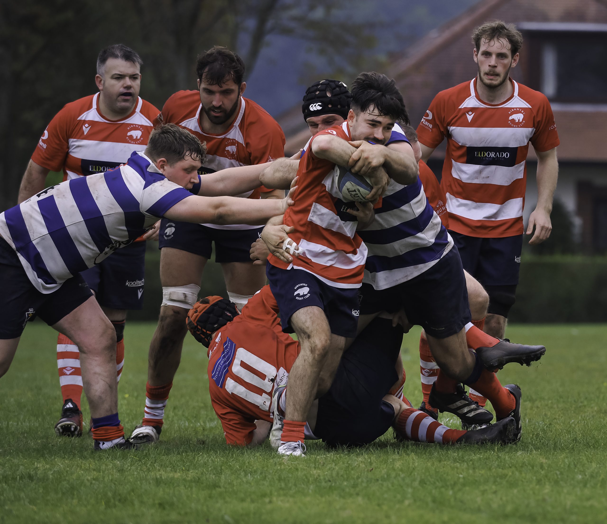 The opening period was very tight with possession shared evenly for the first quarter. However, Strathendrick did look the more likely to score and on the 15th minute, they ran in the first of their 6 scores. Having pressured in the Birkmyre 22, they pounced to score direct from a scrum 5m out. Birkmyre, however, closed the gap only a couple of minutes later when skipper, Ross Moglia, slotted over a penalty from in front of the posts.