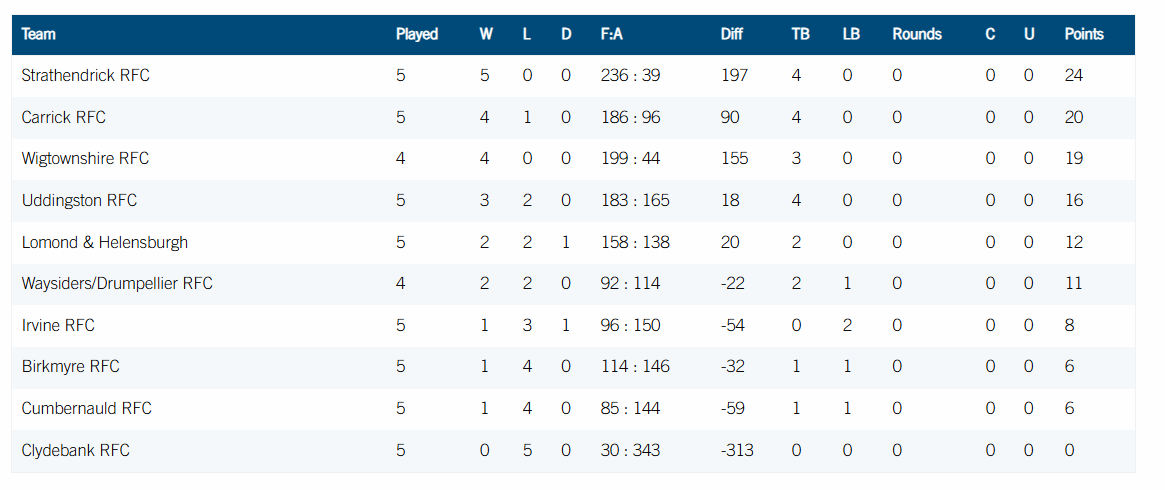 Birkmyre suffered their 4th league defeat on Saturday at home to top of the table Strathendrick, by 40 points to 10. The match was far closer than the result would indicate with the visitors only leading 13-3 at the half.