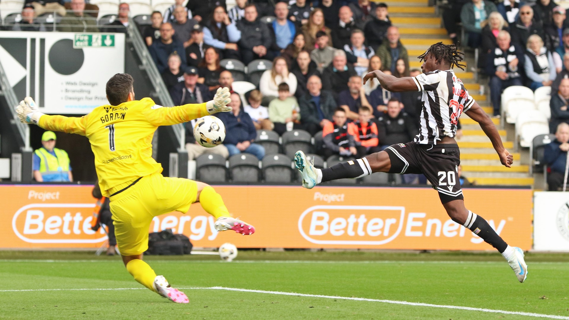 Photo: Saint’s Toyosi Olusanya fires high past Craig Gordon into the Hearts net