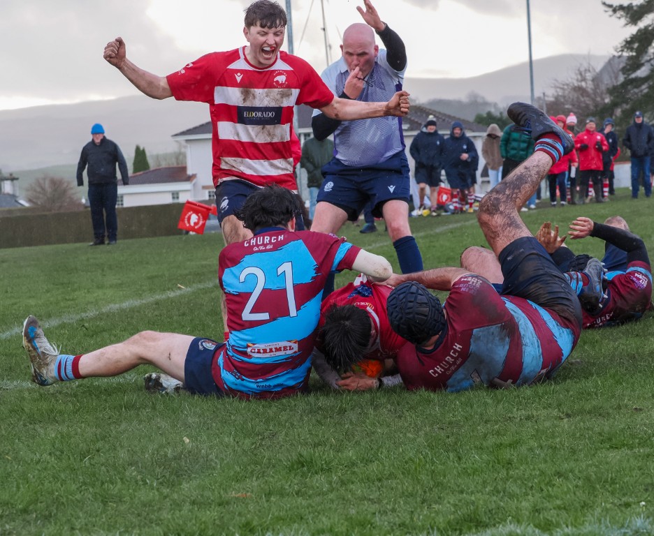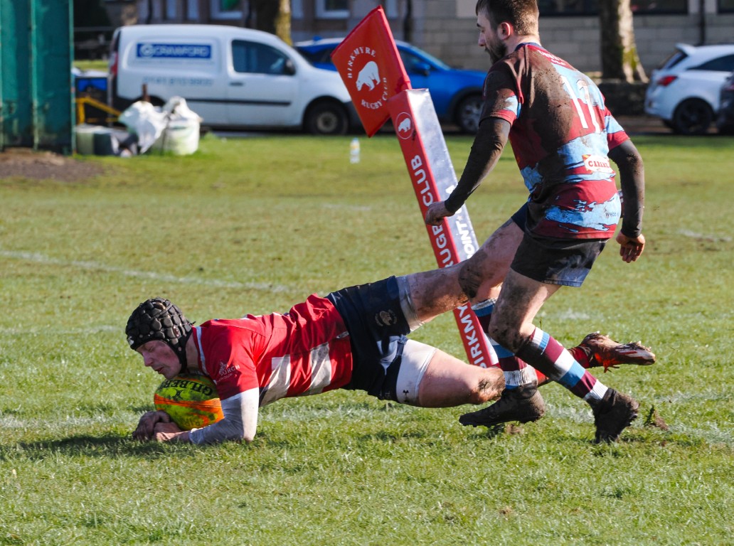 Birkmyre regrouped at half-time and started the second half the better side. However, they were struggling in the scrum and lineout due to injuries. Nonetheless, six minutes into the half, Jonny Davidson scored. From a penalty 10m out in front of the posts, they drove towards the line. After a few phases, Davidson seized the opportunity to pick and go from the bottom of a ruck and dive over for the try.