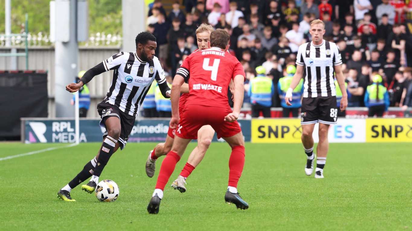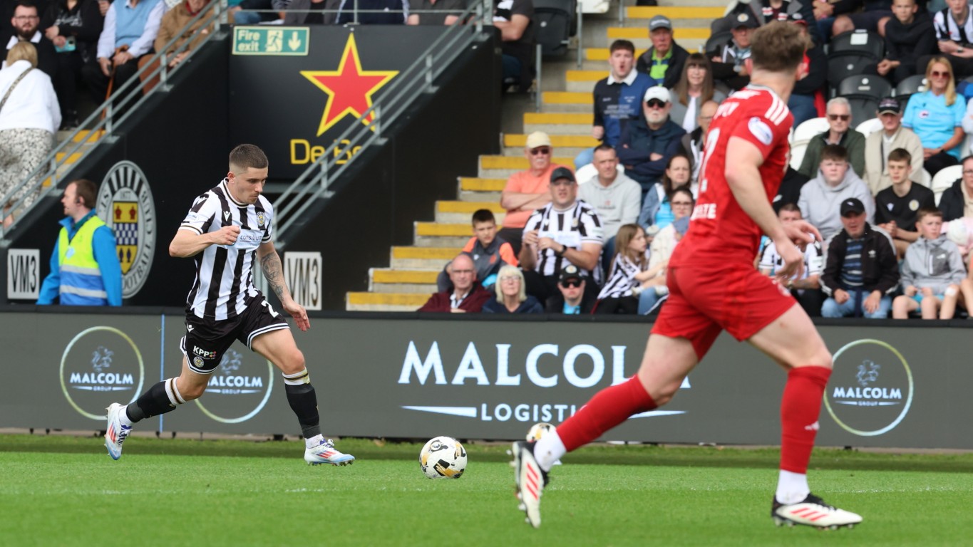 Photo: Saint's Ryan Alebiosu attacking the Aberdeen defence