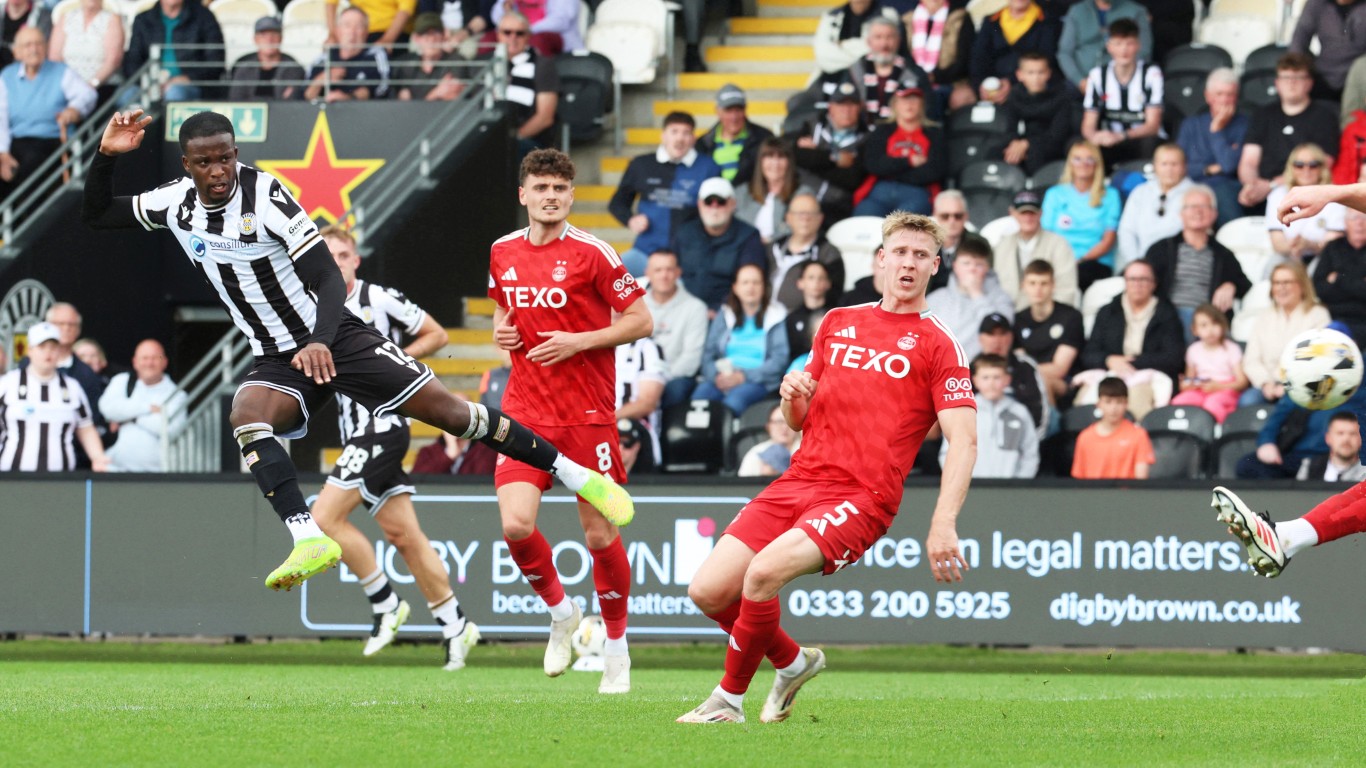 Photo: Saint's Roland Idowu fires a shot at the Aberdeen goal