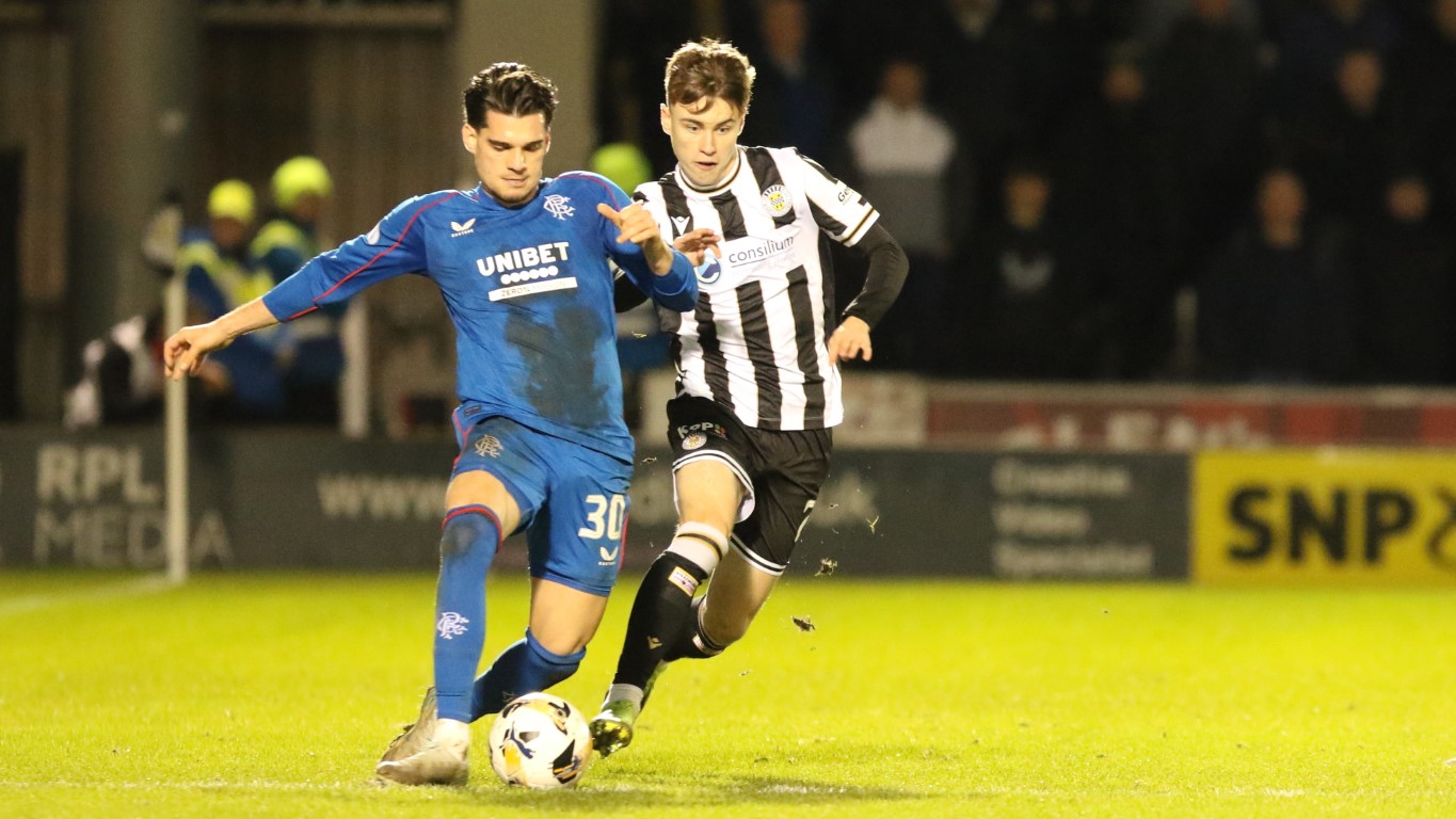 Photo: St Mirren's Callum Penman about to tackle Rangers Hagi