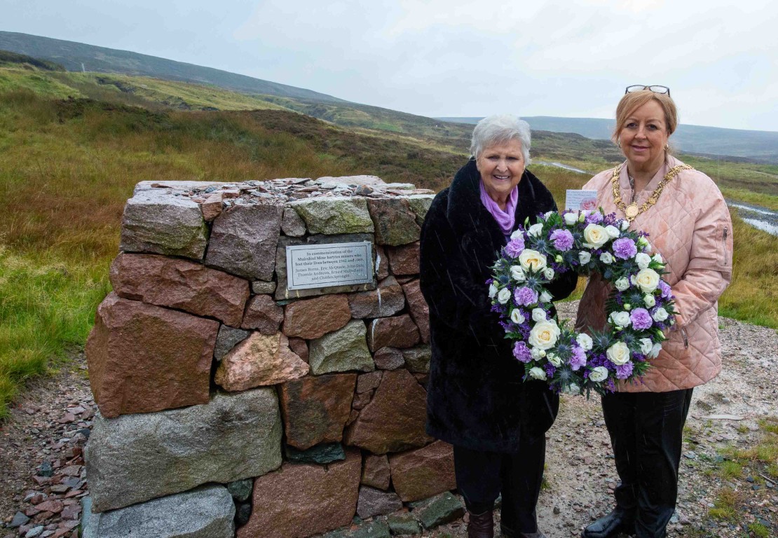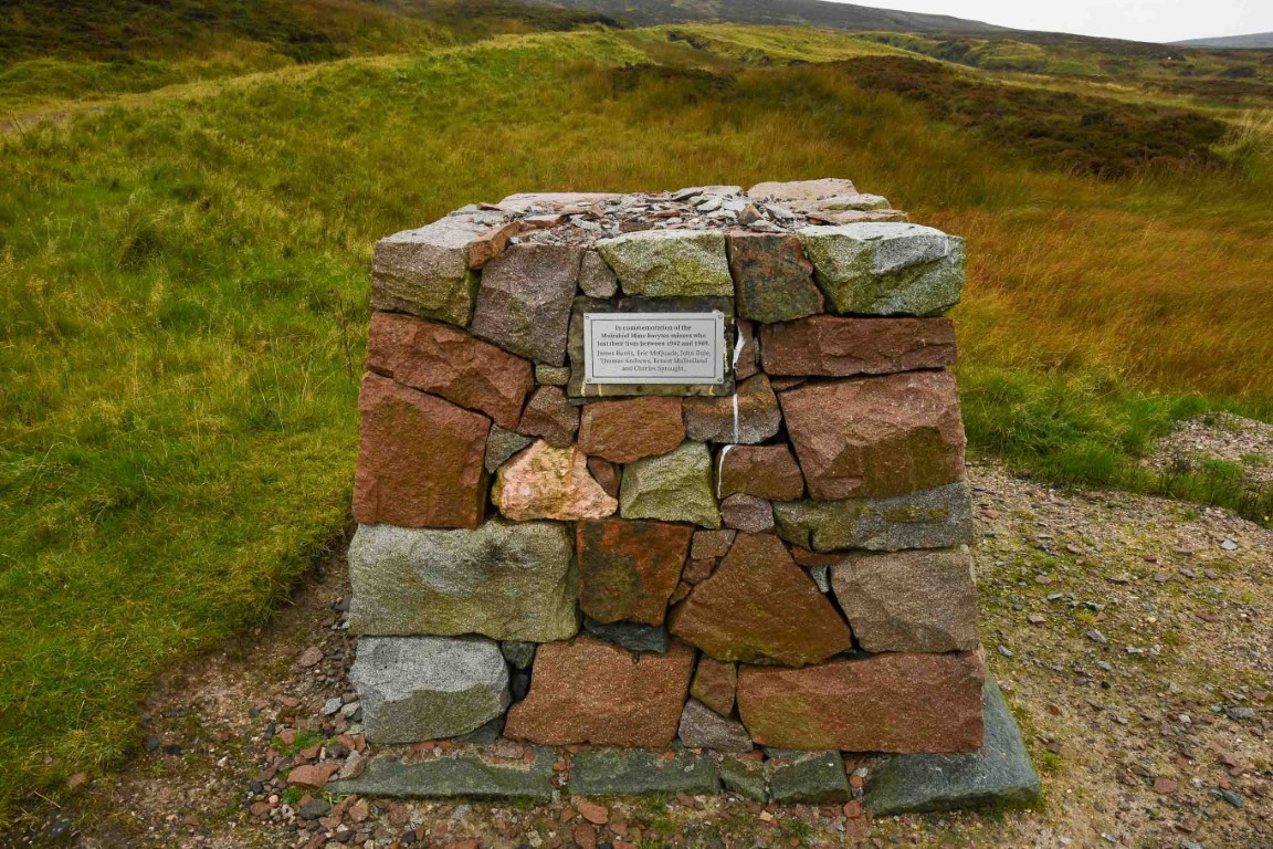 The cairn features a plaque carrying the names of six miners who lost their lives between 1942, when the mine reopened after a brief closure, and 1969 when the mine was closed permanently – James Burns, Eric McQuade, John Dale, Thomas Andrews, Ernest Mulholland and Charles Sprought.