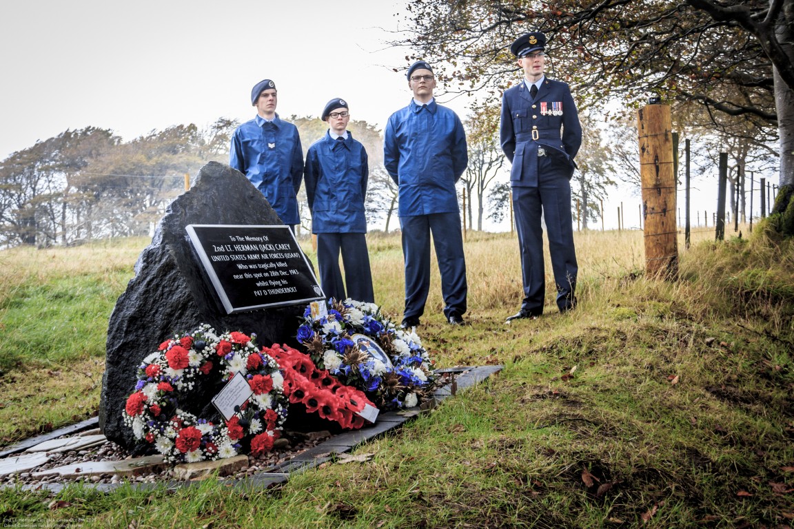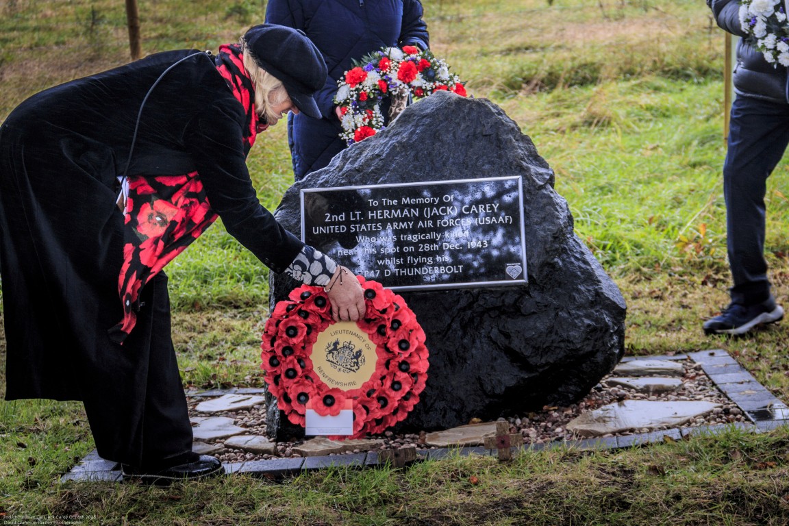 The memorial to 2nd Lt Herman C. “Jack” Carey was officially unveiled by Renfrewshire Provost Lorraine Cameron at the remote Hartfield Moss site on the B775 (Gleniffer Road), surrounded by farmland, moorland and low cloud that made the setting feel almost as isolated as the day of the accident.
