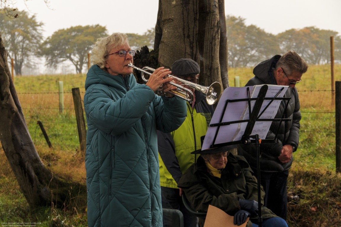 Those present included the Deputy Lord Lieutenant of Renfrewshire, local councillors, members of RAF Air Cadets 1701 Squadron from Johnstone, and members of Howwood Community Council. Among them was Dave Cooper, Secretary of the Howwood Community Council, who has led much of the work over recent years to ensure Lt Carey’s story is remembered and who led the ceremony.