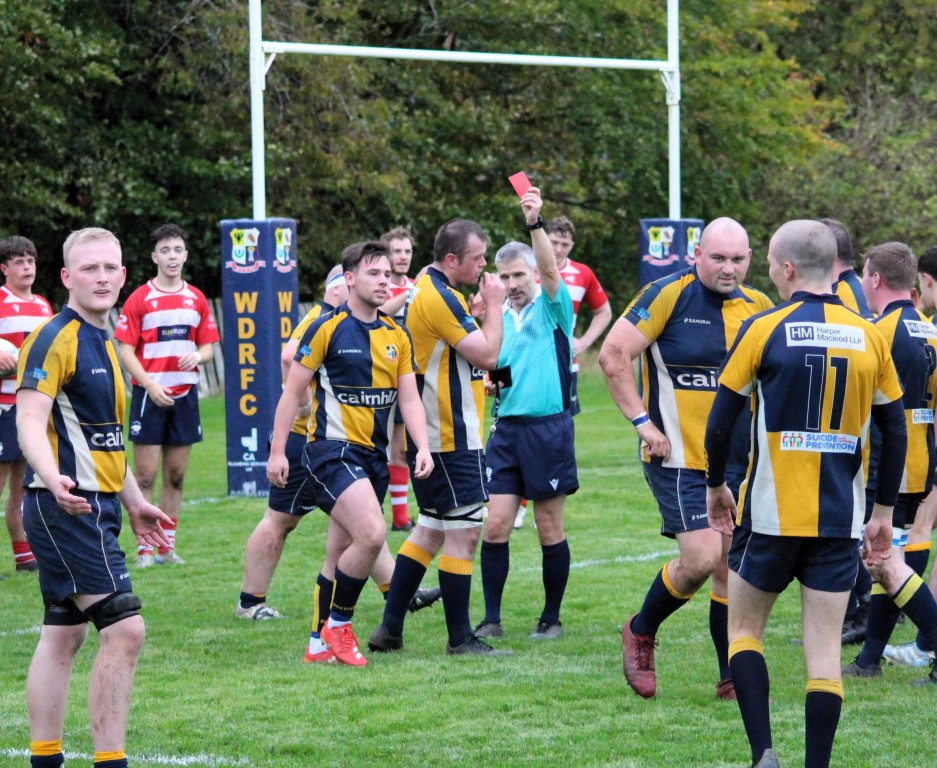 The Coatbridge side added a further penalty on 34 minutes to make it 20–0. They ended the half a man down again after another yellow was shown for a high tackle.