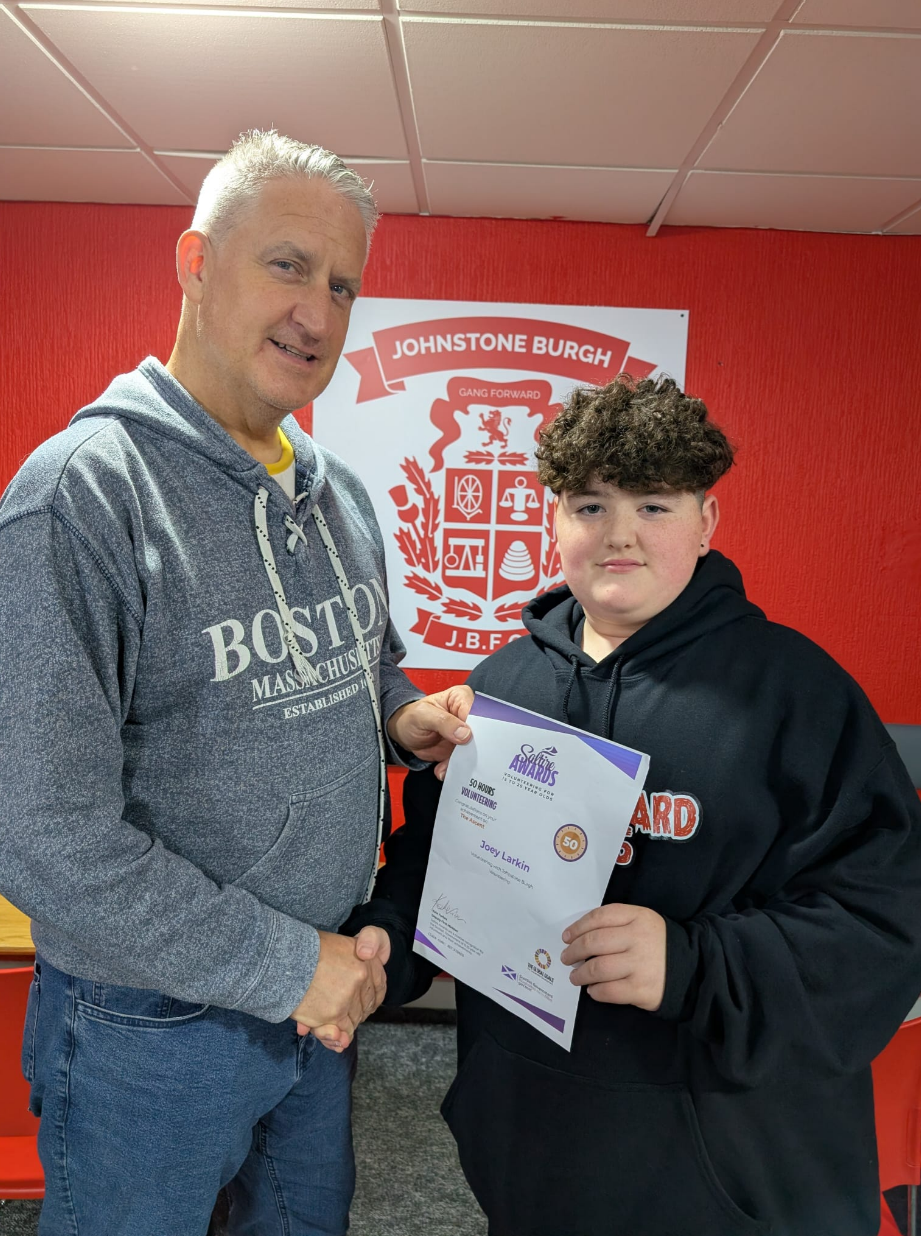 Headline photo: Mackenzie Cameron (left) receiving an award from former Johnstone Burgh club secretary Robert Kerrigan