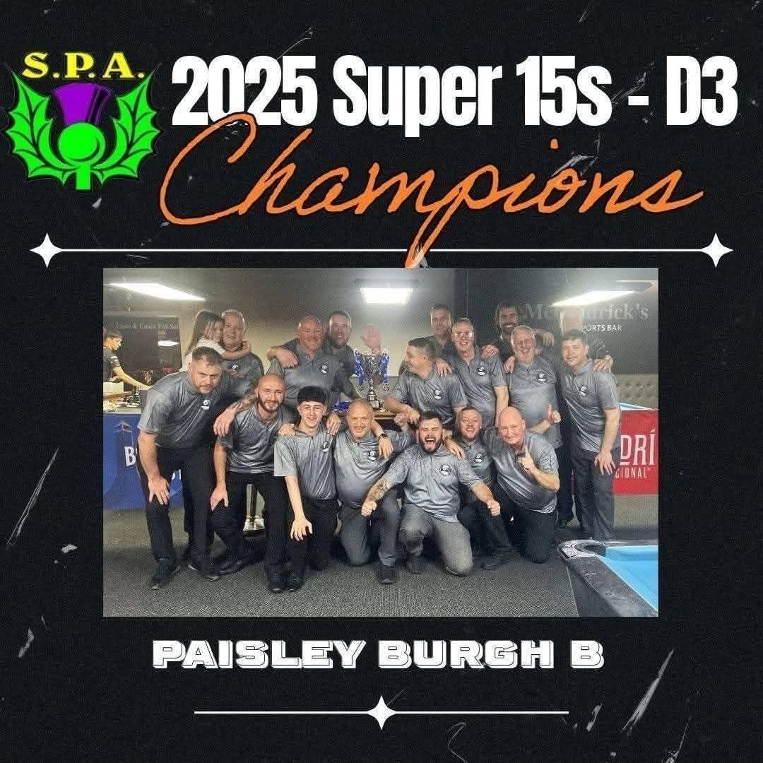 Their success follows an already strong run for the Paisley Burgh Pool League. Paisley A have now earned back-to-back promotions, including their 8–6 win over Arbroath B in the final on Sunday 16th November 2025. Gregor, James and Shawsy won the closing frames that confirmed the title and the move up to the top tier.