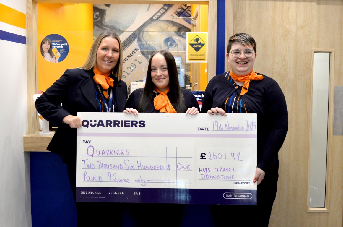 Three members of staff from Hays Travel in Johnstone handed over a cheque for more than £2,600 after completing a half-marathon walk to support Quarriers’ children’s services.