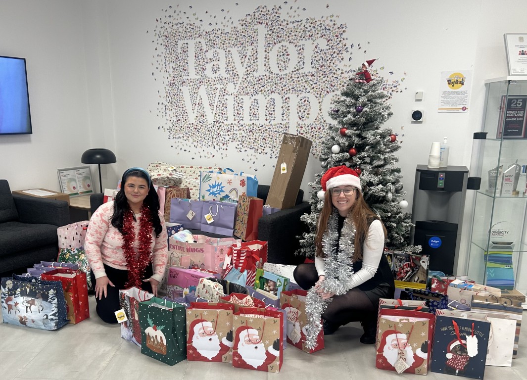 Image caption: Kara Newman and Amy Coster from Taylor Wimpey West Scotland in their regional office in Paisley with 70 gift bags bound for The Renfrewshire Toy Bank