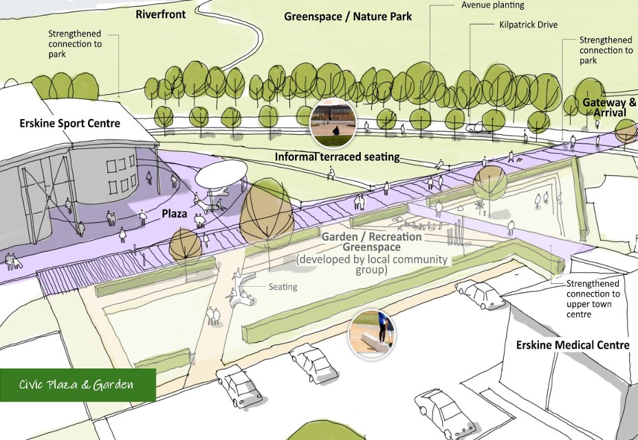 A new civic plaza, garden and events space will be created in Erskine to provide a focal point for the local community.