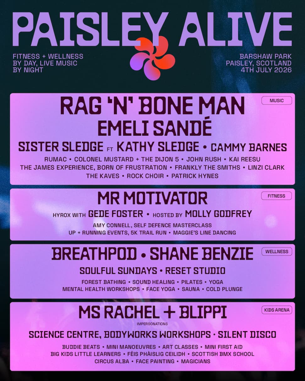 Sande joins a headline line-up that already includes Rag’n’Bone Man, Sister Sledge featuring Kathy Sledge, Mr Motivator and Cammy Barnes, as well as Ms Rachel and Blippi impersonations. The festival will also showcase a wide range of Scottish and local performers, with newly highlighted acts including Kaves, Patrick Hynes and Rock Choir, alongside wellness partner Reset Studio from Glasgow.
