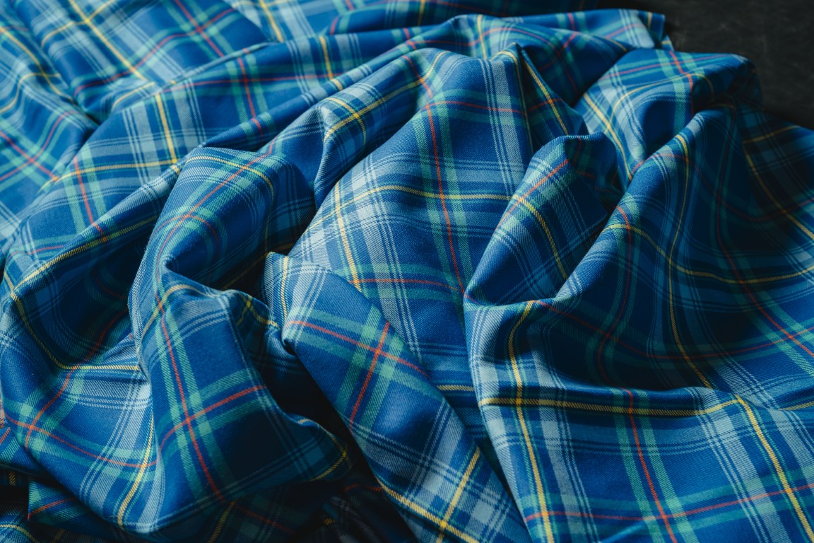 The tartan features a vibrant blue base, alongside lighter blue, green, orange and yellow threads, reflecting the energy, creativity and community spirit at the heart of the charity’s work.