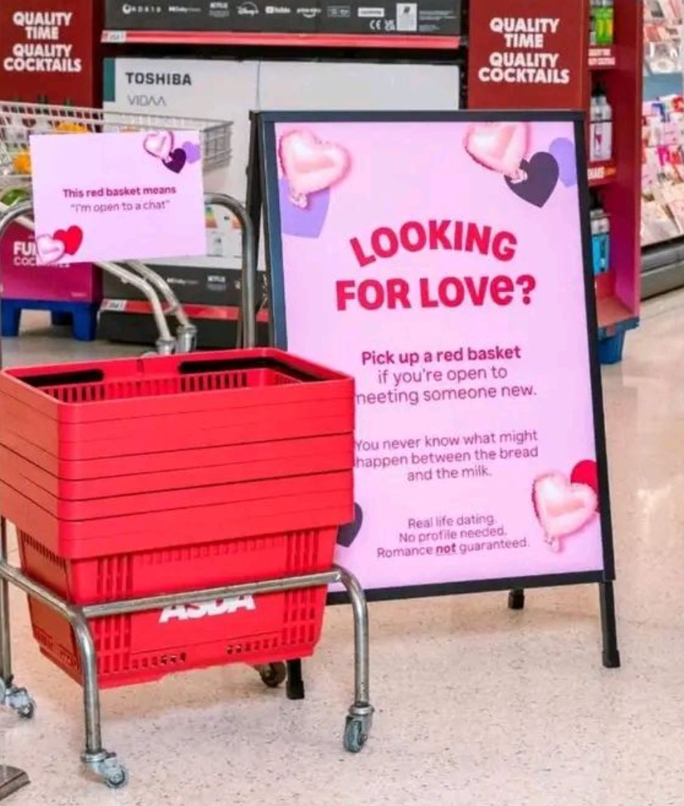 An Asda spokesperson said: “We know people are craving real-life connections, but we also know our customers are busy and don’t always have the time to put themselves out there. That’s why we’re turning the weekly shop into the ultimate meet-cute. These red baskets are a fun, light-hearted way to help people connect while they’re already doing their everyday shop – a simple, playful nudge to start a chat and maybe even spark a little romance.”