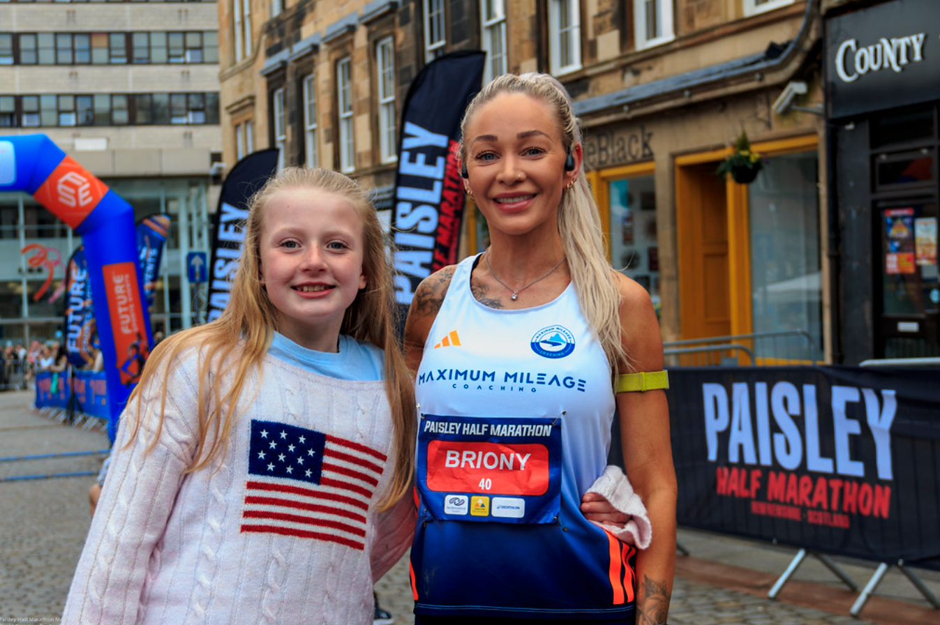 Photo: Women’s winner Briony Cornish with her daughter after the first ever Paisley Half Marathon
