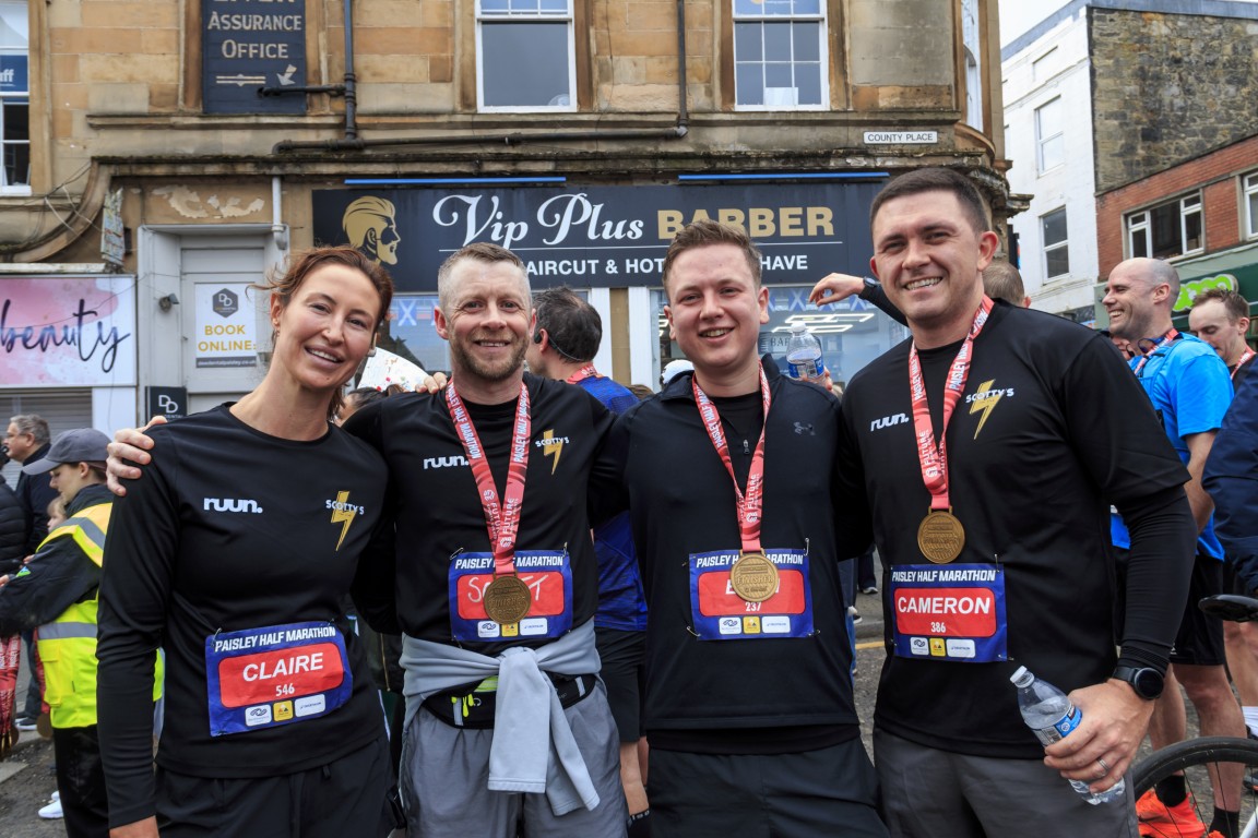 Photo: Claire Morgan, Scott McLaughlin, Euan Reid and Cameron Sinclair of Scotty’s Run Club after completing the Paisley Half Marathon