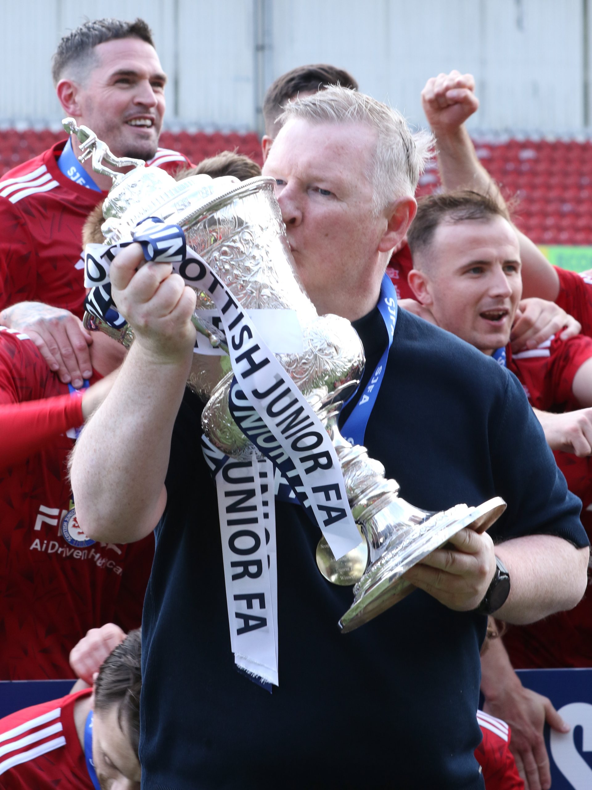 Photo: Murdo McKinnon lifts the Scottish Junior Cup after leading Johnstone Burgh to victory over Tranent in June 2025